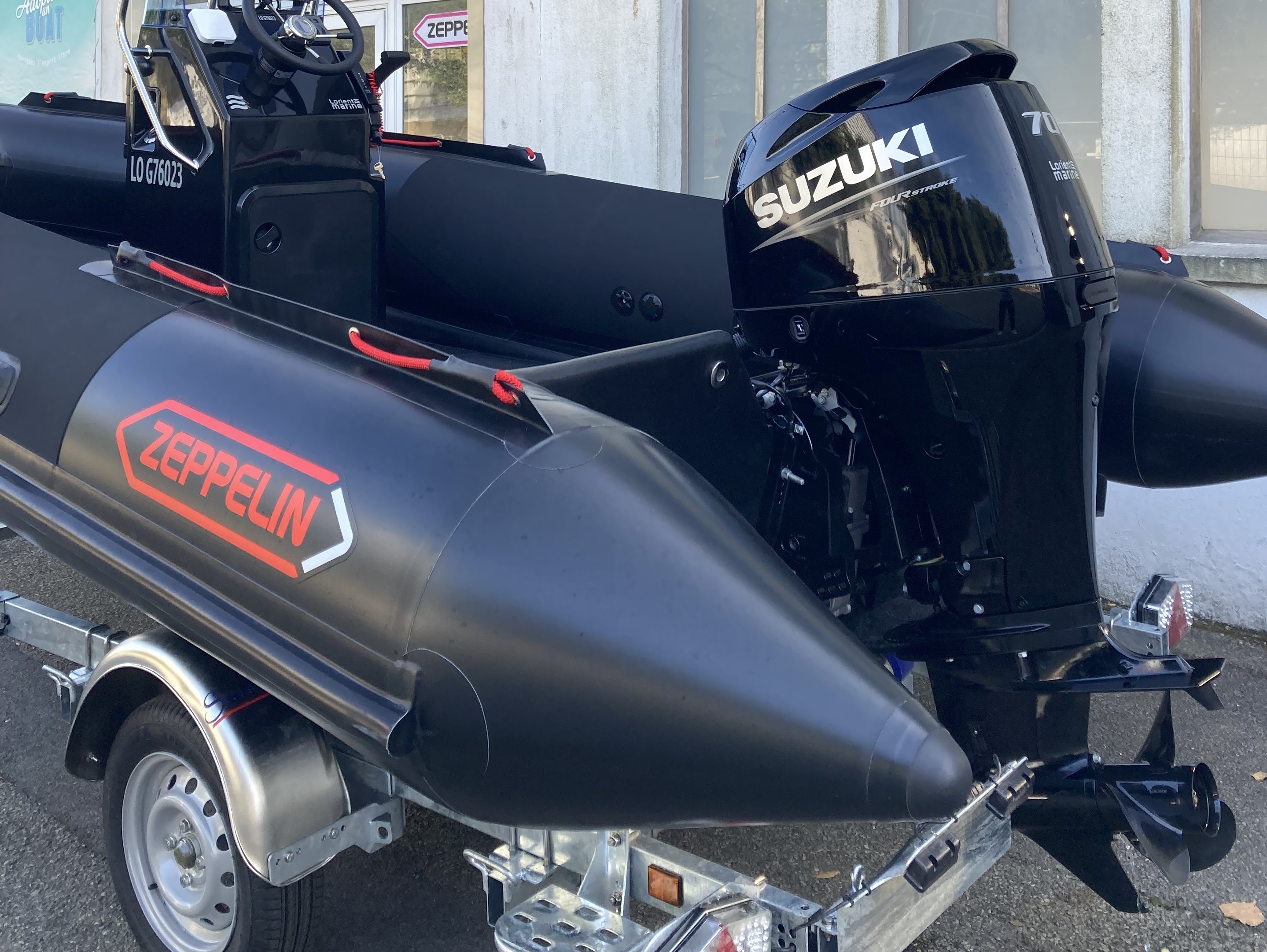 Ce semi-rigide "couteau-suisse" est équipé ici de l'excellent Suzuki DF70ATL au couple très impressionnant malgré ses seulement 1,5L de cylindrée. Ceci est dû à la double démultiplication qui conduit à une réduction d'embase de 2,59:1, permettant d'embarquer une hélice de 14 pouces de diamètre.