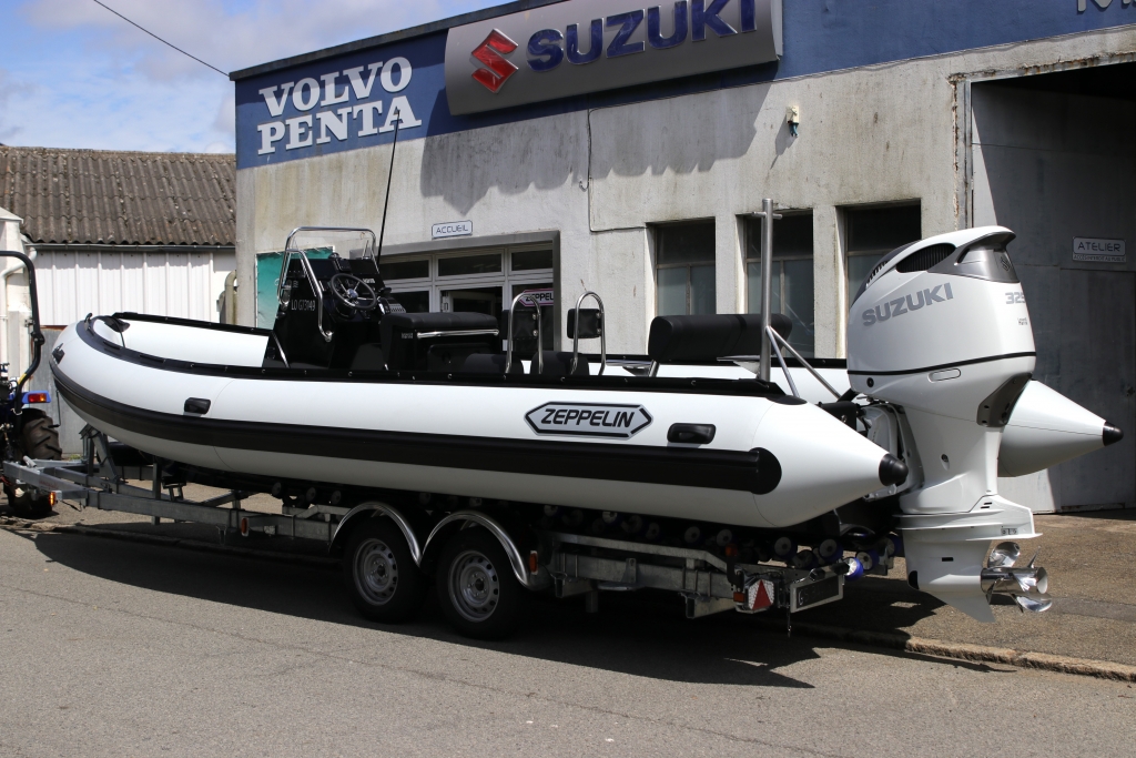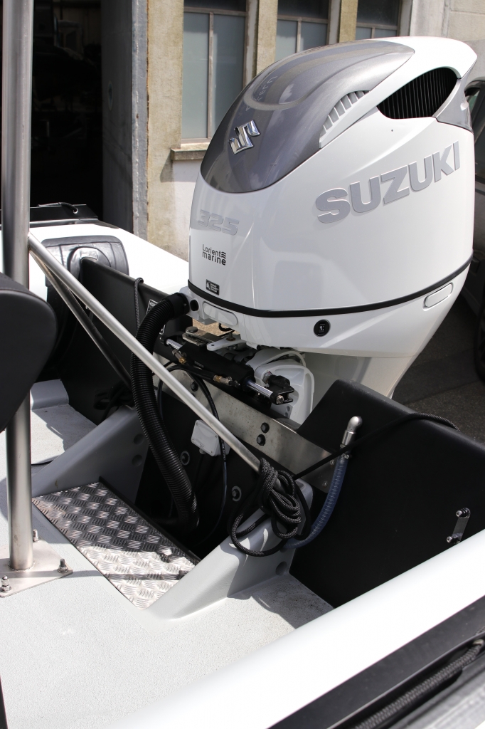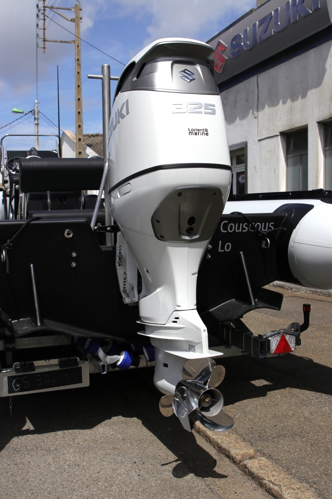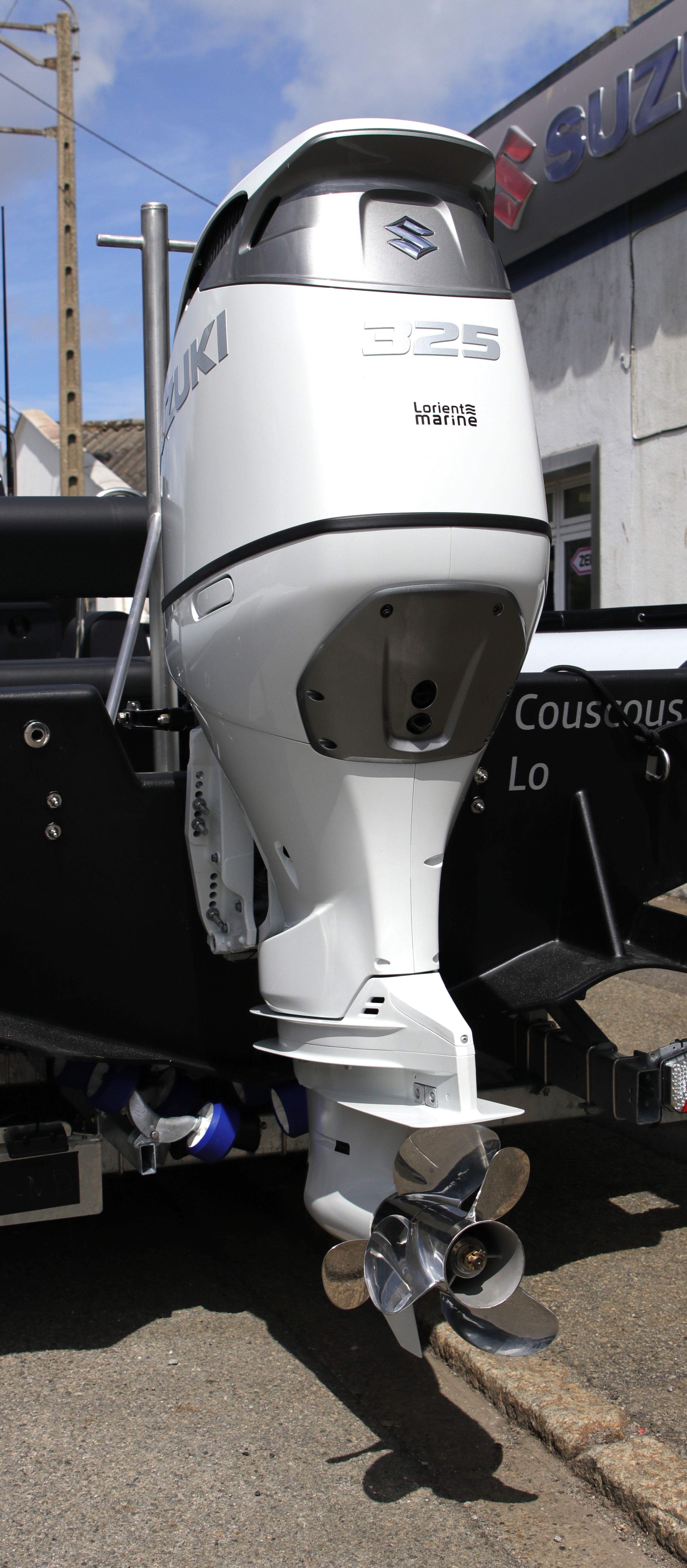 - La puissance du Suzuki DF325A à 2 hélices contrarotatives lui confère une vitesse maximum très élevée, proche de 50 kt, pratique pour rattraper un bateau de course qui acclère facilement à plus de 30 kt